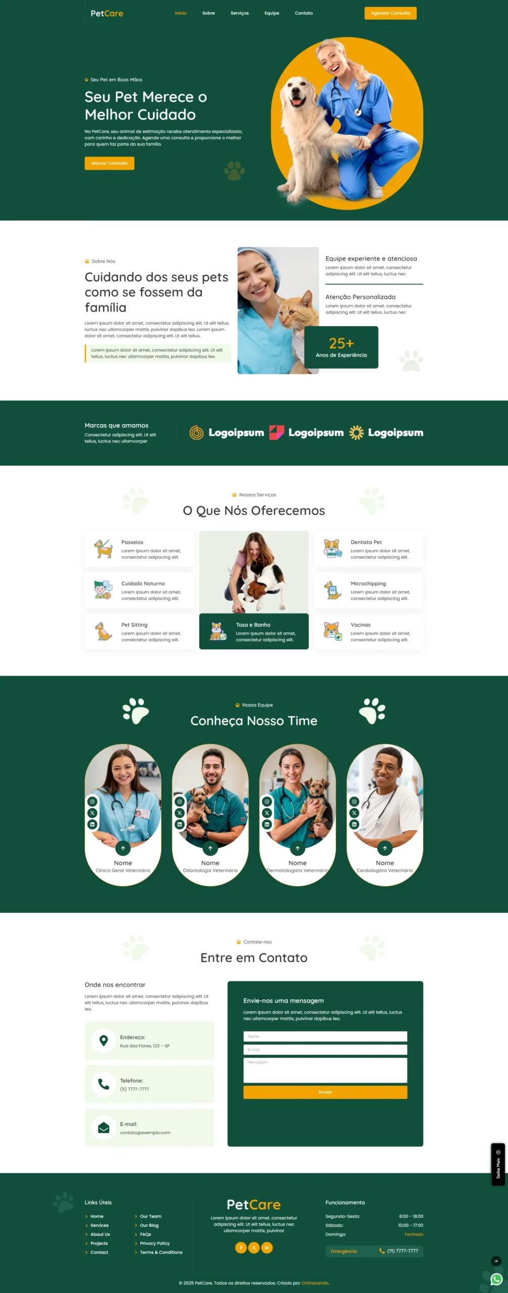 Site pensado para agendamento e urgência: botão direto para WhatsApp, página de serviços e área para orientações de cuidados.